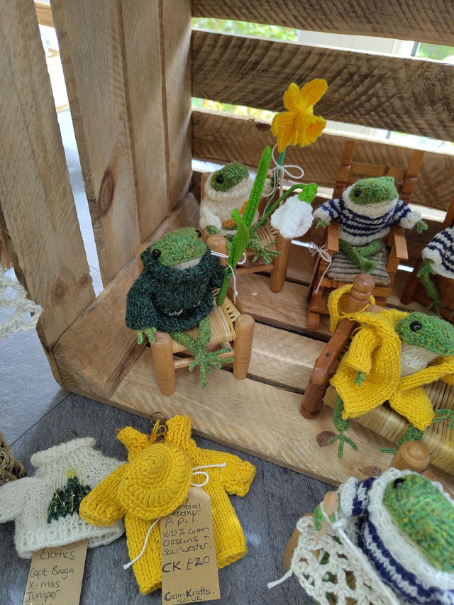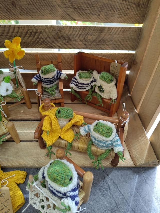 This Flower Frog is a whimsical, hand-knitted creation made from durable Shetland wool with a wire armature for poseable charm and lasting structure. The frog wears a hand-knitted merino wool jumper, featuring a hand-embroidered flower that matches the single stem of a hand-crocheted wired flower it holds, completing the floral theme. Based on the Claire Garland (Dotpebble Knits) pattern, this miniature yarn creation is perfect as a collectible knitted frog, unique handmade gift, or decorative artisan doll. Combining artisan craftsmanship, whimsical charm, and imaginative design, it’s an enchanting addition for lovers of handmade yarn art, Shetland wool knitted frogs, and Claire Garland Dotpebble Knits creations.