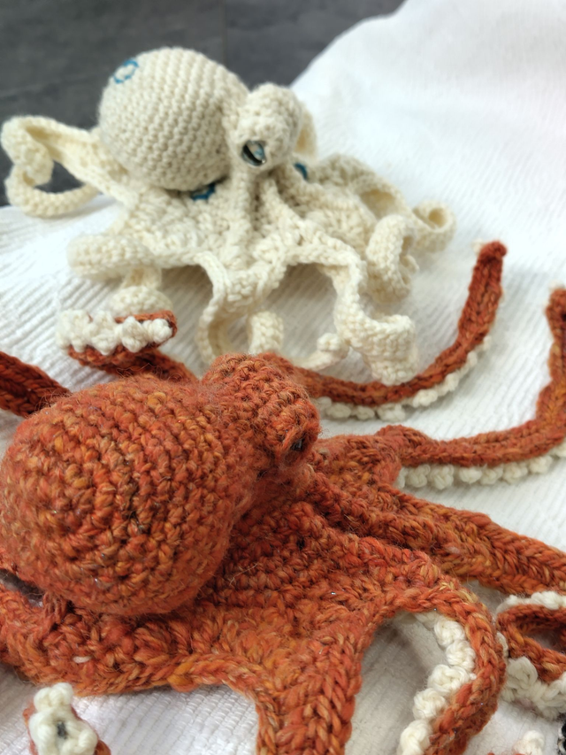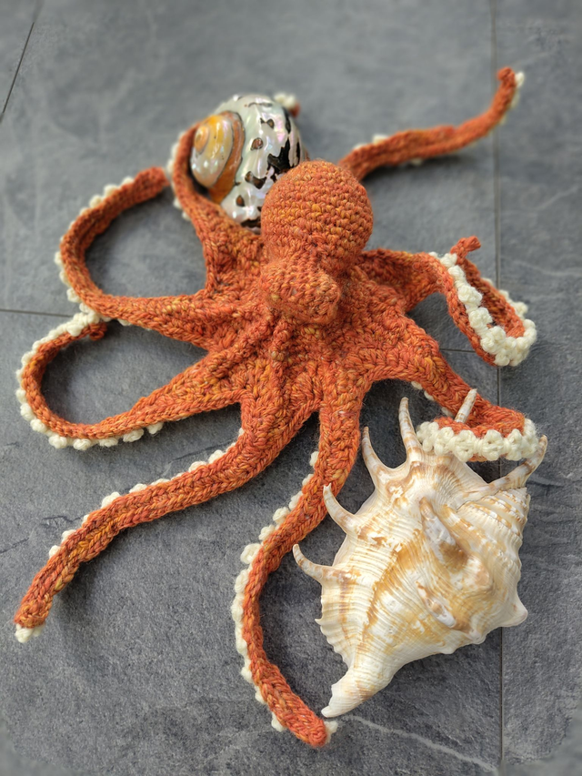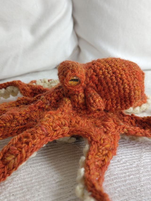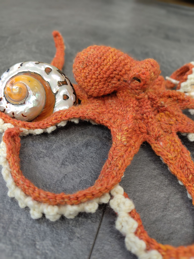Hand Crochet from Edinburgh hand-spun 99% Shetland Aran with 1% nylon Sparkle yarn, with warm amber coloured hand painted glass eyes and weighted arms and under mantle, complete with Syphon tube, this is one of the most realistic Octopuses I've ever crocheted. She weighs 150g and has a tentacle span of 50cm when arms are outstretched. Styled from a Giant Pacific Octopus this is a very special make.