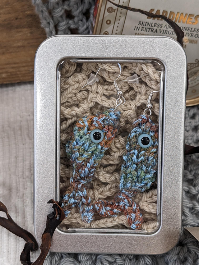 Add a touch of nautical charm to your jewelry collection with these sterling silver or plated Silver sardine earrings, inspired by Capten Broga (Claire Garland Dotpebble Knits pattern) crafted with delicate attention to detail. Each pair comes beautifully tinned in a whimsical landing net bag, reflecting the playful maritime world of Capten Broga. These earrings make a perfect gift for lovers of handmade nautical jewelry, whimsical collectibles, or maritime-inspired accessories. Lightweight, durable, and full of personality, they’re ideal for adding a subtle Welsh coastal flair to any outfit or display.